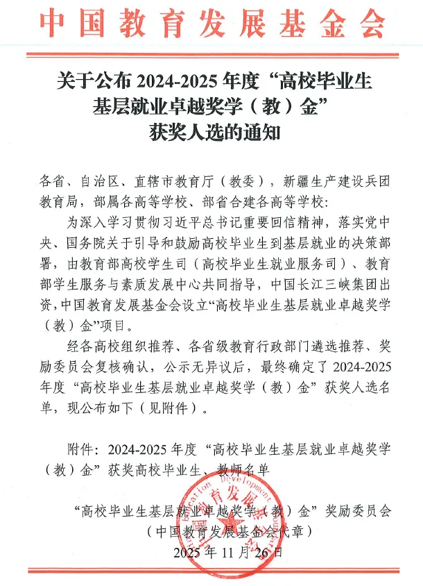 近日,教育部、中国教育发展基金会公布了2024-2025年度“高校毕业生基层就业卓越奖学金”获奖名单。“高校毕业生基层就业卓越奖学金”由教育部高校学生司(高校毕业生就业服务司)、教育部学生服务与素质发展中心共同指导,中国长江三峡集团有限公司出资,中国教育发展基金会设立,旨在贯彻落实党中央、国务院关于引导和鼓励高校毕业生到基层就业的决策部署,奖励赴基层就业并做出突出业绩的普通高校毕业生。此次河北省共有21位毕业生获得该奖项,学院智能工程学院2020届通信技术(通信工程造价方向)专业毕业生司雨获奖。
